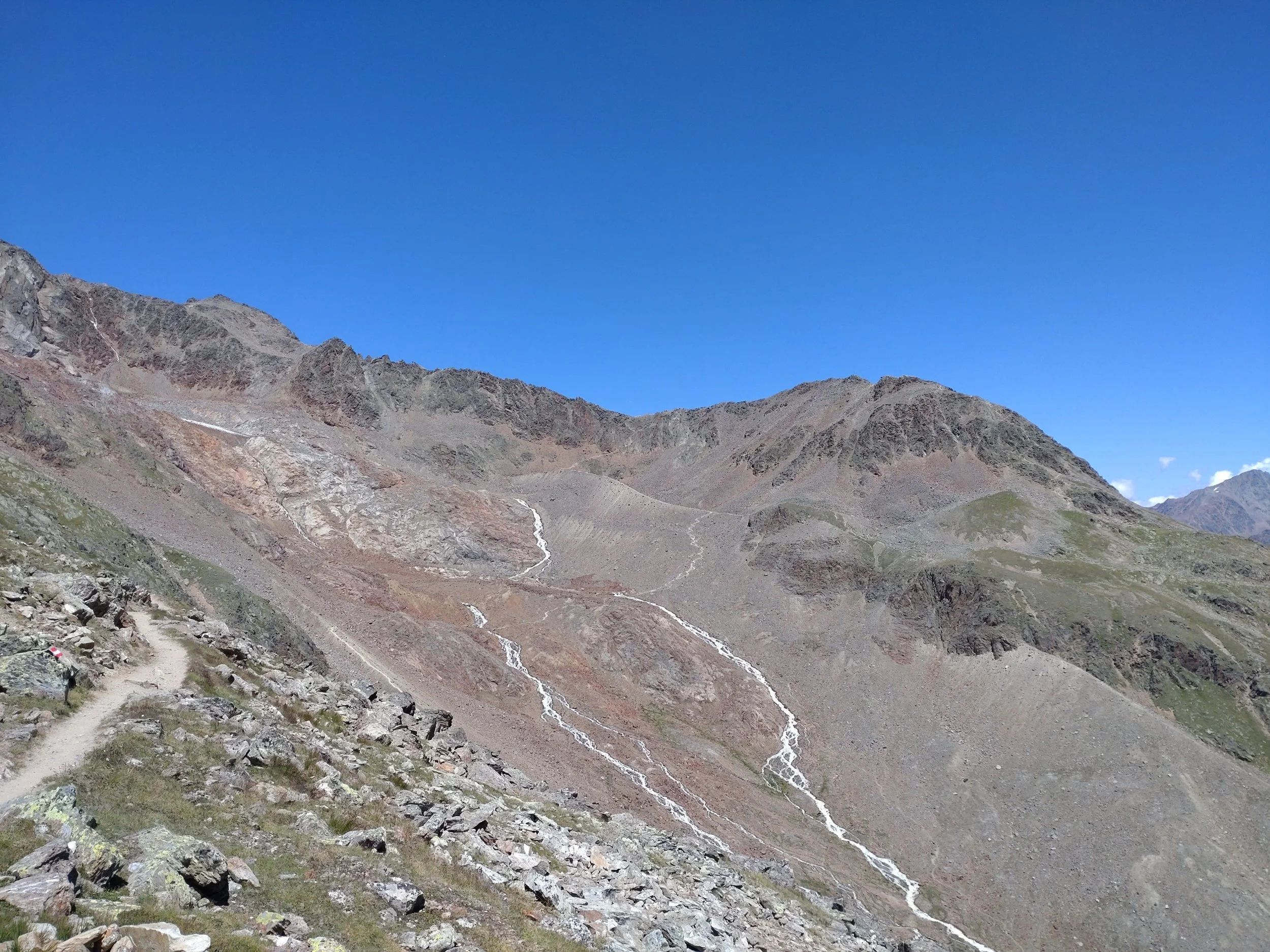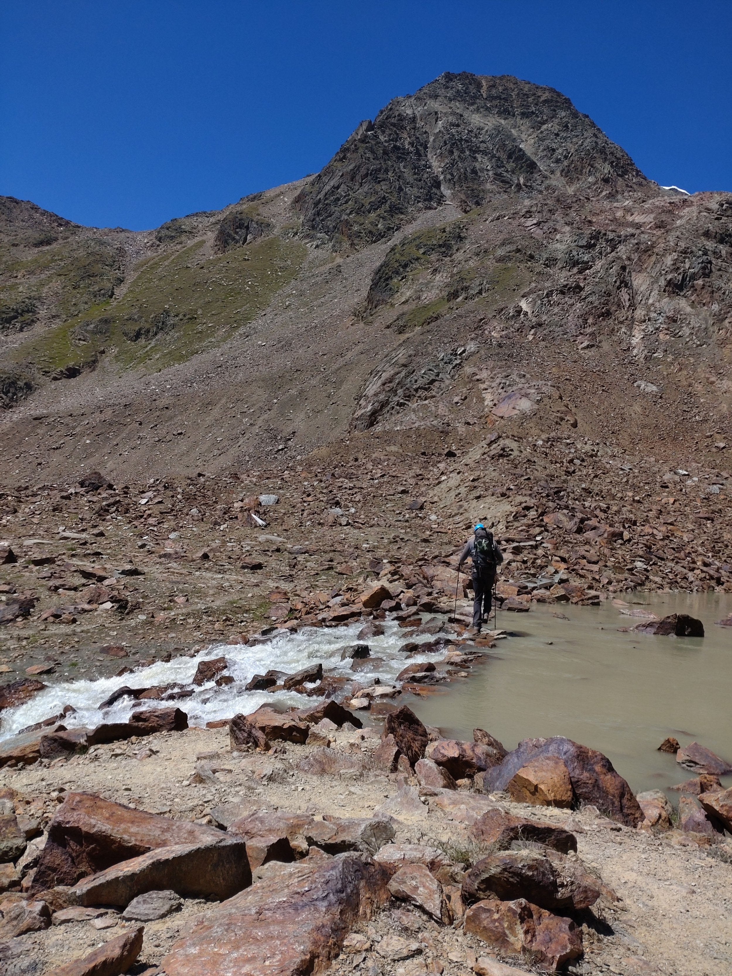 Nachdem unsere Freunde am Ende ihres Urlaubs wieder zurück nach Köln fuhren, machten wir uns auf nach Vent - ein sehr beschauliches Bergdorf am Ende des Ötztals, das auf fast 2.000m liegt. Da wir uns noch nicht zu viele Höhenmeter zumuten wollten, starteten wir unsere Tour in Vent mit einer Sesselbahnfahrt auf ca. 2.400 und marschierten dann zu Fuß los zum “Wilden Mannl”. Nach einigen schmalen Alpenpfaden und ein bisschen Kraxelei erreichten wir schon vor Mittag den Gipfel auf 3020m - Mein (Anjas) ersten 3.000er! Wir wurden auch direkt mit Jubelrufen begrüßt, allerdings galten diese einem kleinen Hund, der ebenfalls seinen ersten 3.000er bestiegen hatte. Nachdem wir eine Gruppe auf ihrem Weg zum Gletscher beobachtet haben, folgten wir ihnen - zunächst über viele lose Steine und Geröll. An der sichtbaren Gletscherkante angekommen stellten wir fest, dass unter dem Geröll noch Eis lag und es teilweise hohl darunter war - ein beunruhigendes Gefühl. Dennoch wollte ich mir die ersten Schritte auf dem Gletscher nicht entgehen lassen und schnallte die Steigeisen an. Es läuft sich wirklich super damit auf Eis - noch besser als mit Schneeschuhen! Während der Gletscher in der prallen Mittagssonnen immer größere Bäche produzierte, beendeten wir diese aufregende Stippvisite mit der Wanderung zur Breslauer Hütte. Dabei mussten wir noch einmal einen reißenden Gletscherfluss überqueren. Wir freuten uns sehr auf Speis und Trank und eine erfrischende Dusche! Ich war ganz schön perplex, als man mit der Halbpension einfach so noch einen Nachschlag von dem leckeren Champignonrahmschnitzel mit Kartoffelpürree bekommen konnte. :) Gutes Essen macht nach so einer Tour wirklich sehr glücklich!