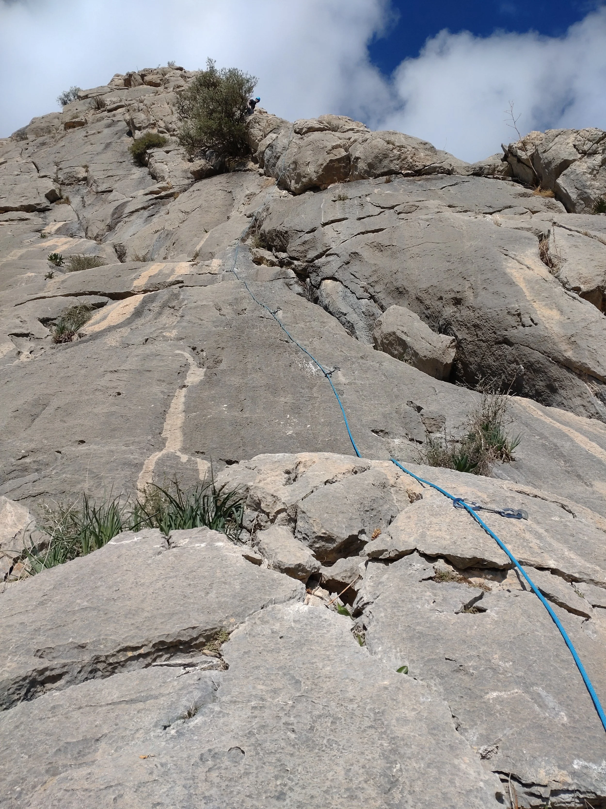 Nach dieser Route waren wir schon gut durch und haben einen Pausentag gemacht. Am Tag drauf sind wir die Lluvia de Asteroides (V+) geklettert mit Heinz, einem Klettertrainer aus der Gegend Göttingen, den Anja am Supermarkt kennen gelernt hatte. Sie hatte mit ihm bereits an dem Tag, an dem ich in einer Videokonferenz war, den Klettersteig dort gemacht! Es war unsere erste MSL in 3er Seilschaft, die uns Heinz aber sehr gut erklärt hat. Es war sehr gesellig nicht immer alleine am Standplatz zu sein und war eine gelungene und logische Linie an einer markanten Kante entlang!