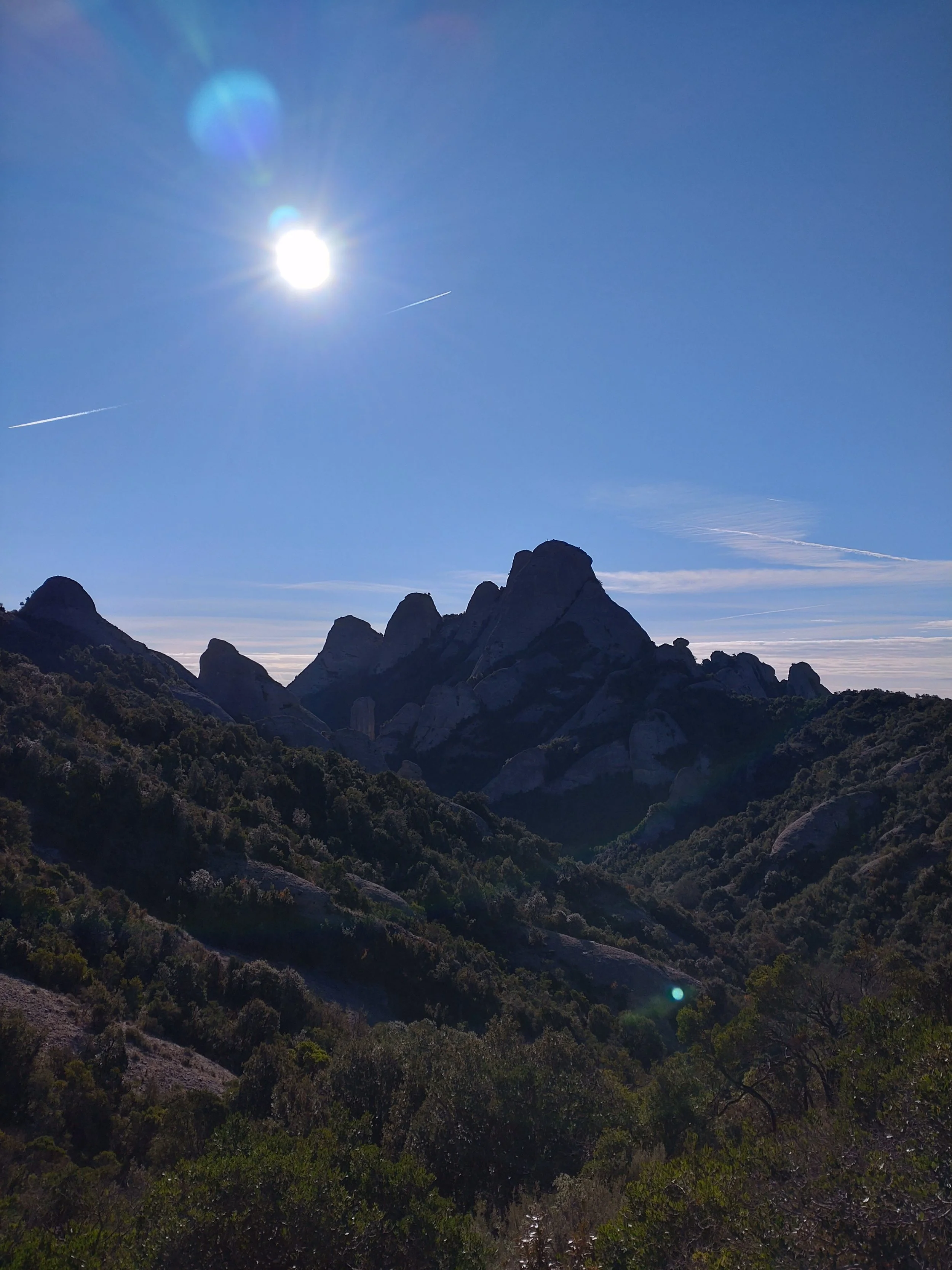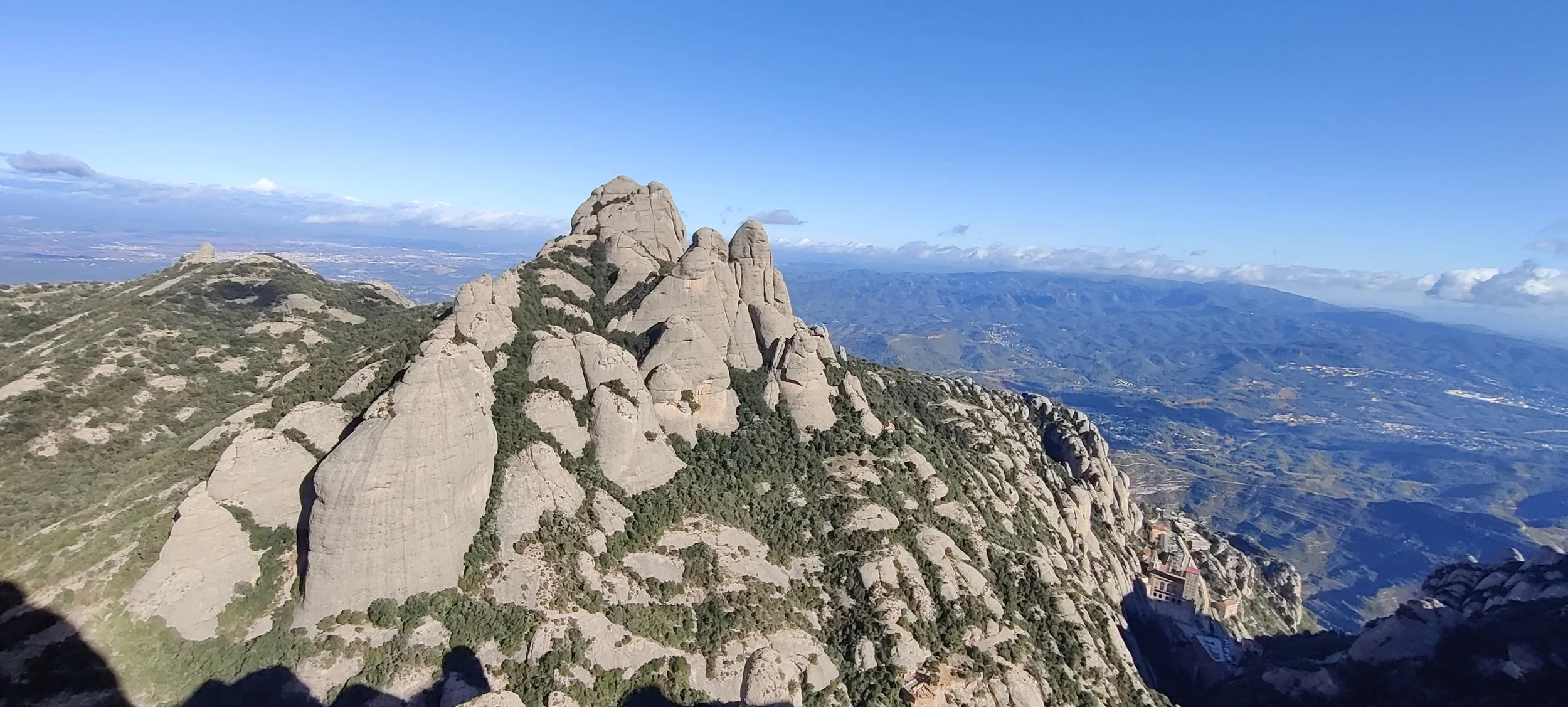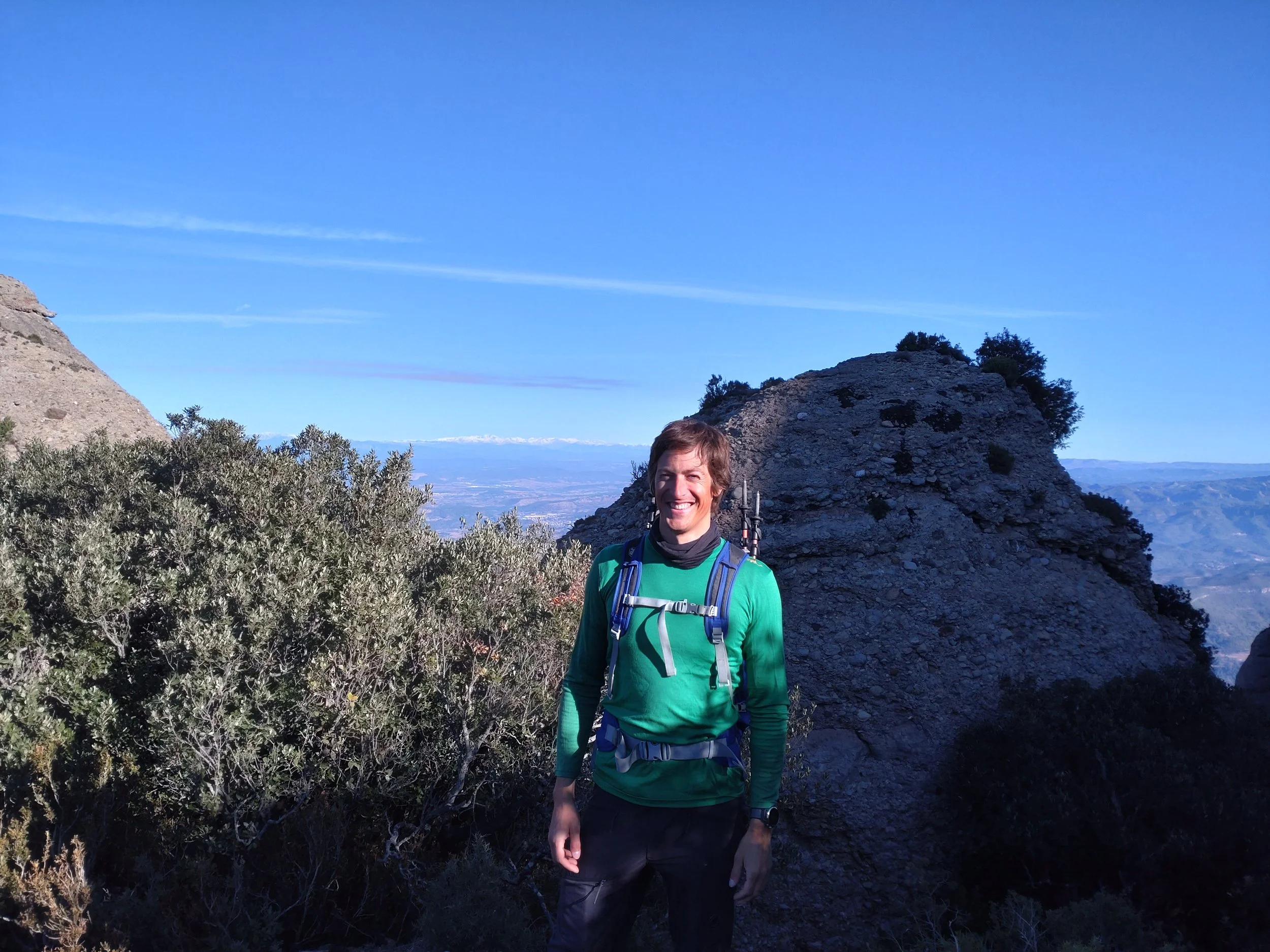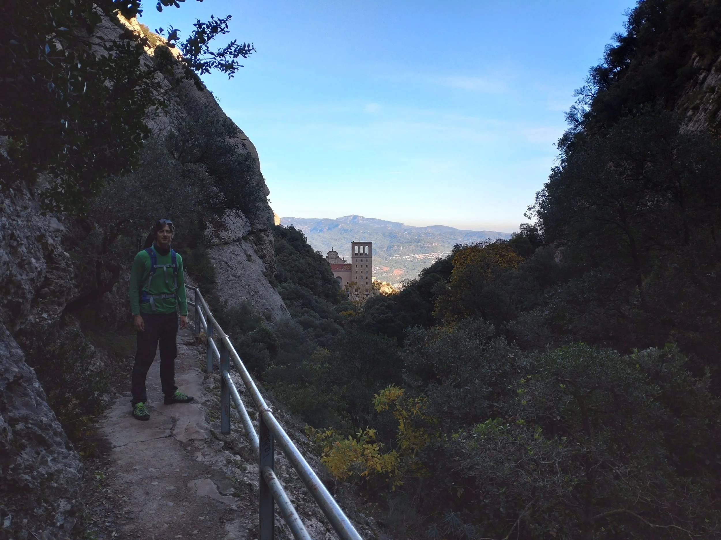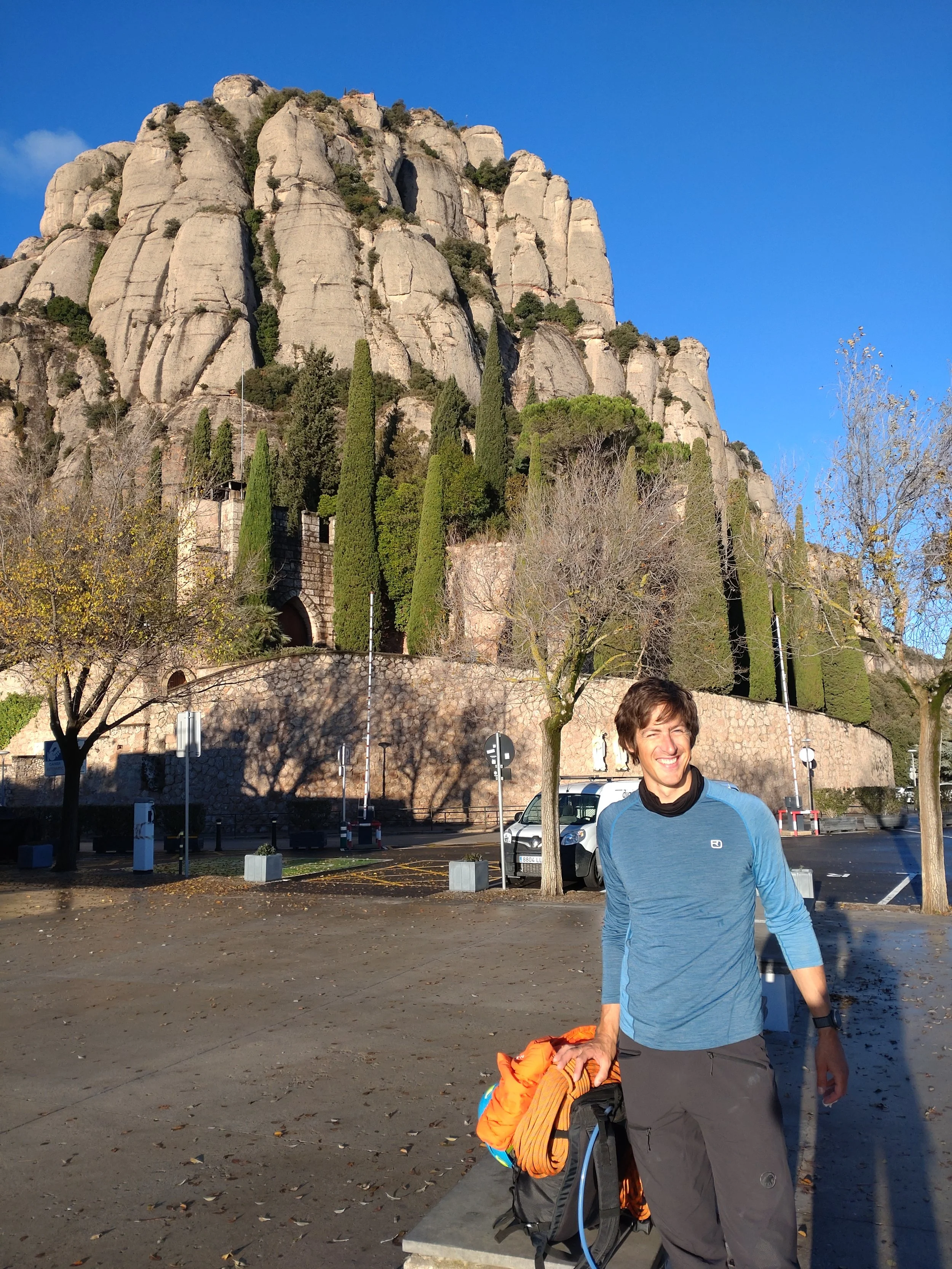 Wir fuhren also von der Autobahn und überlegten uns an einem Stellplatz auf 600m Höhe an der Straße direkt am Einstieg in die Wände eine Wanderstrecke für den Folgetag. Während dieser Wanderung, wo wir auch sehr einsame und steile Wege geplant hatten und aber auch auf den örtlichen Touristenberg San Jeroni kamen und am Ende am Kloster raus kamen, lernten wir das Gebirge etwas kennen. Beim Kloster bei einem Buchladen haben wir uns dann einen Auswahlkletterführer gekauft. Montserrat, so finden wir heraus, ist die größte Klettergegend in Spanien mit über 4000 Routen. Der Auswahlkletterführer war also so dick wie woanders ein ganzer Guide. Drin sind nicht nur viele Klettergärten, sondern super viele Mehrseillängen und auch viele Trad und Halbtrad-Routen.
