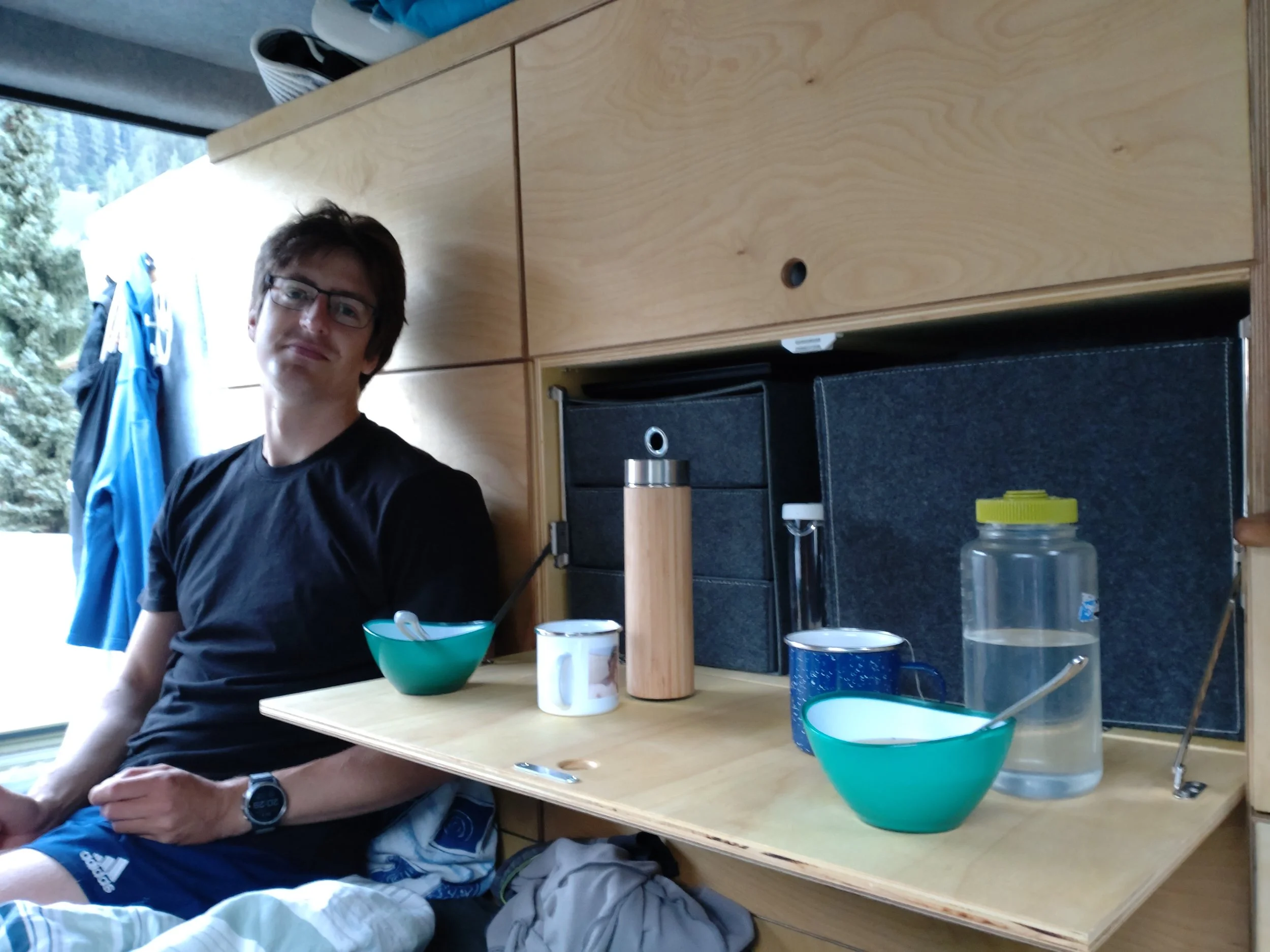 Nun sind wir in den Dolomiten am Toblacher See und waren die letzten beiden durchwachsenen Tage in tollstem Kalkfels klettern, was super Spaß gemacht hat. Haben zwei 2er-Seillängen geklettert, beide um die 30m lang, das war mal wieder schön. Auch 6a (6+) im Vorstieg war wieder drin, trotz der langen Pause vom Klettern. Uns geht’s gut, die Gesundheit und Fitness ist wieder zurück, wir essen und trinken lecker und bewegen uns viel. Vielleicht schmeißen wir die Tage mal die Standheizung nachts an, weil es mittlerweile herbstlich wird nachts mit unter 10 Grad im Bus 😊
